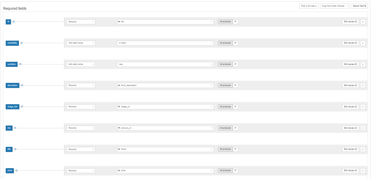 Tal como se muestra a continuación en la imagen, Facebook tiene 9 campos obligatorios para el feed. Asegúrate de asignar todos correctamente. Los campos son los siguientes: