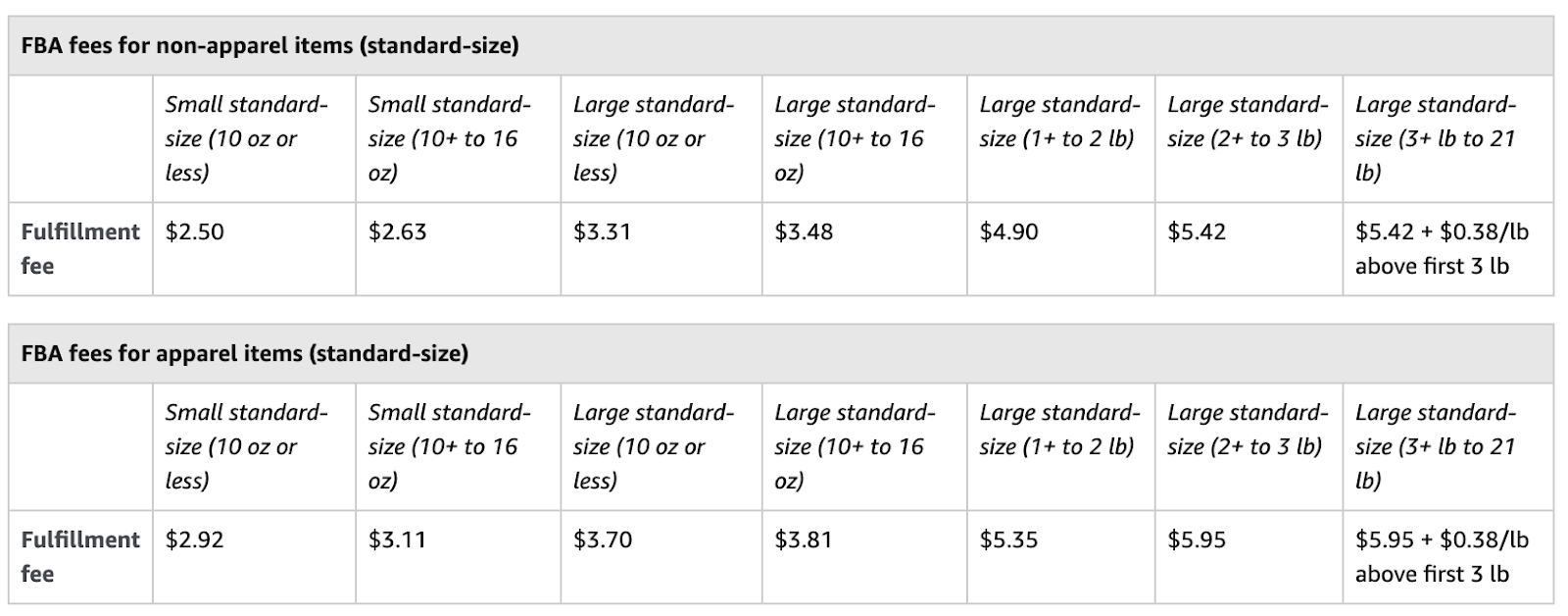 Tarifas para ropa y accesorios y otros productos (tamaño estándar) y tarifas para productos que no son de ropa y accesorios (tamaño estándar)